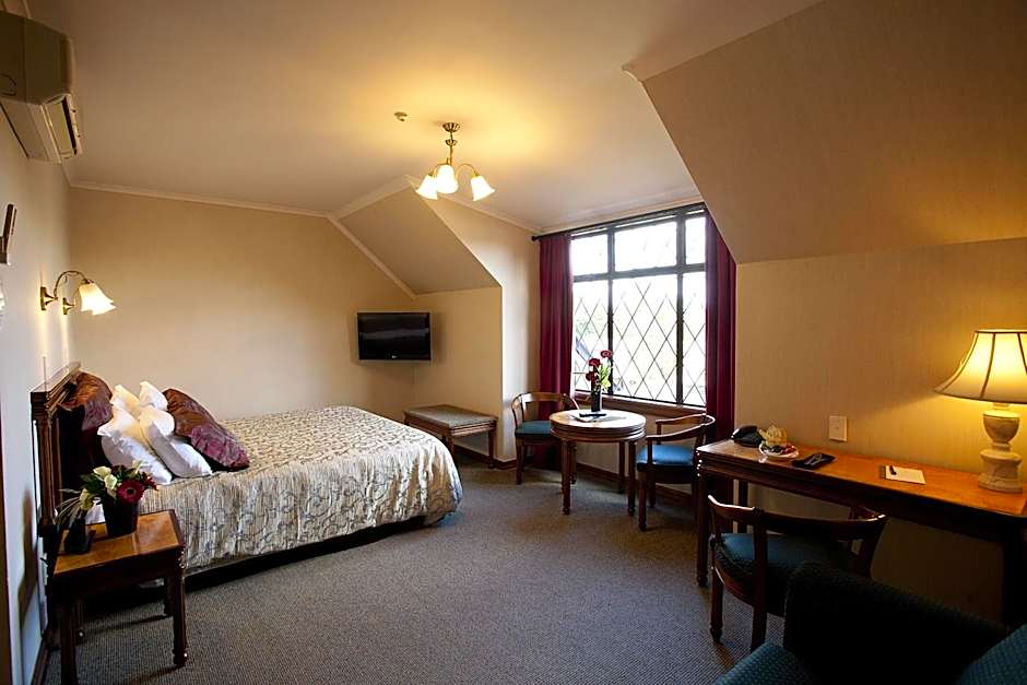 Spacious room with work desk. Some rooms have views over the rose garden.